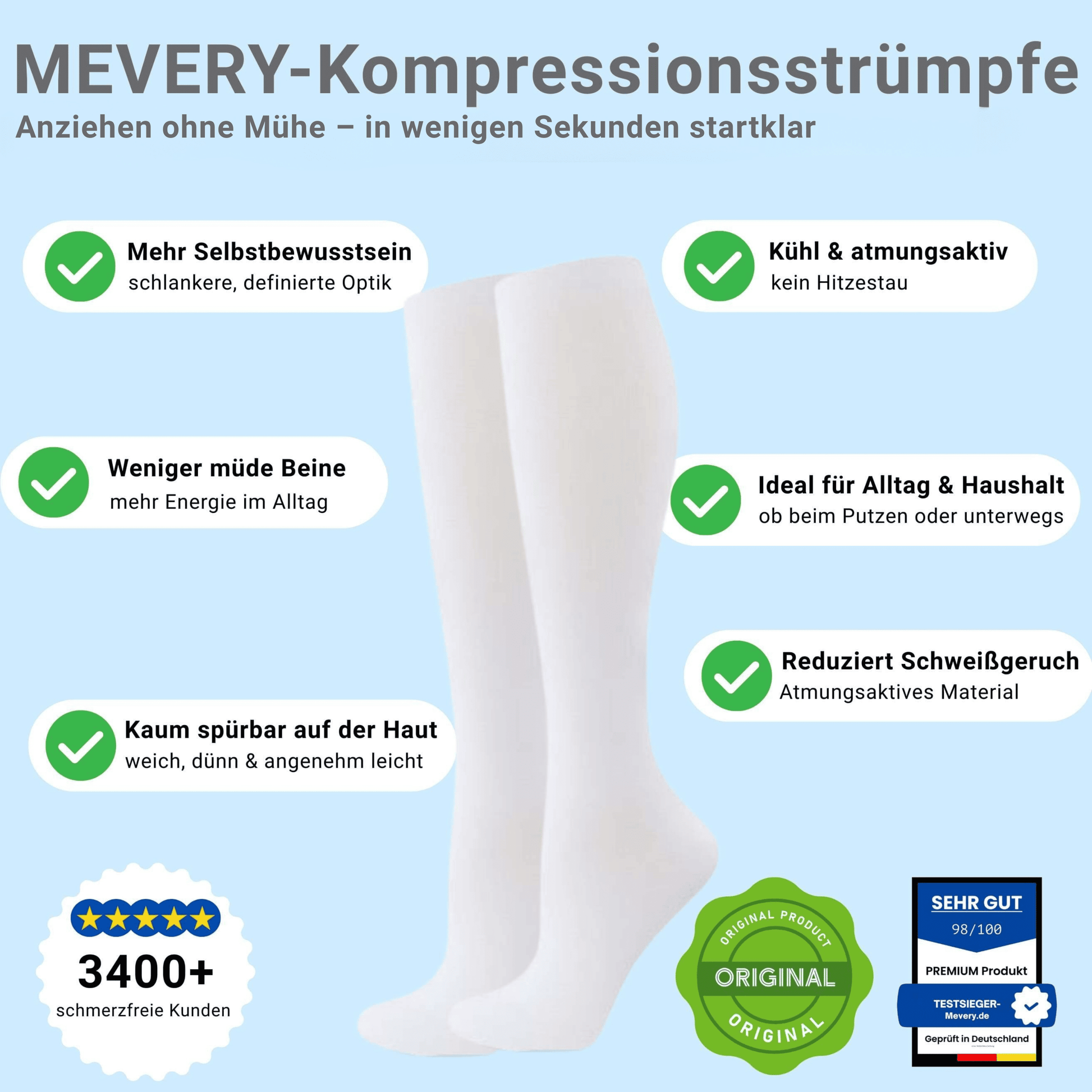 Die Mevery Kompressionsstrümpfe wurden dafür entwickelt, dich im Alltag zu unterstützen – mit abgestufter Kompression und angenehm weichem Material.